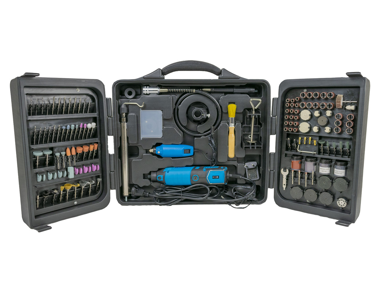 Багатофункціональний набір з двома граверами (додатковий міні-гравер 12 В), гнучким валом, штативом та набором насадок (236 шт.) для широкого спектру робіт. Гравер Kraissmann дозволить виконати свердління, шліфування, гравіювання, фрезерування та полірування у дереві та м'якому металі. Основний гравер з прогумованим корпусом, потужністю 180 Вт, оснащений регулятором швидкості обертання шпинделя, що дозволяє вибрати потрібний режим для кожного конкретного завдання. Міні-гравер має швидкість обертів 12 000 об/хв і відмінно підходить для тривалих шліфувальних робіт, а його невеликі розміри дозволять виконати роботу, що вимагає особливої точності. Гравер Kraissmann також комплектується телескопічним штативом, струбциною та пензлем для видалення пилу та стружки з робочого столу. Все це поставляється у зручному розкладному пластиковому кейсі.
